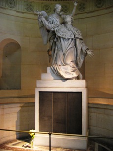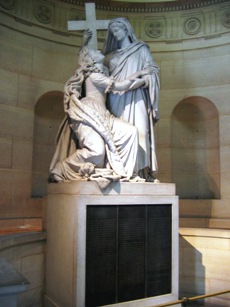 groupes : Louis XVI montant au ciel, soutenu par un ange dont les traits seraient ceux de l’abbé Edgeworth (réalisé par Bosio) et Marie-Antoinette soutenue par la Religion figurée sous les traits de Madame Elisabeth (inhumée quant à elle au cimetière des Errancis) (réalisé par Jean-Pierre Cortot).