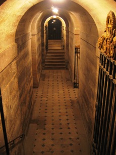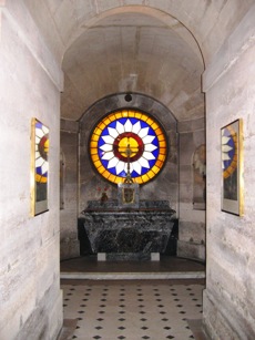 Deux escaliers conduisent à une crypte voutée où s’élève l’autel, en forme de tombeau, édifié au dessus de l’endroit-même où ont reposés les restes de Louis XVI durant 21 ans.