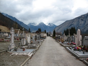 Le petit cimetière communal n’offre rien de très particulier : il se dresse dans un cadre austère, entouré par les montagnes (paysage dramatique selon les Américains).