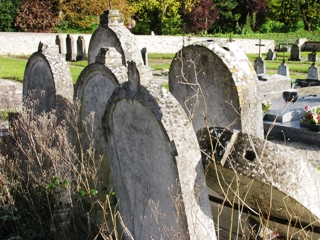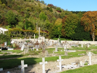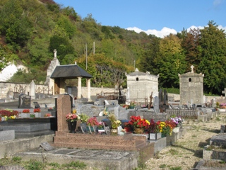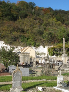 Le cimetière se trouve à la sortie est du lieu, sur la route de Vétheuil. De taille modeste, il a conservé ses vieilles chapelles, ses croix rouillées, ses stèles bancales : il est vrai que compte tenu de la place qui reste, il serait stupide d’abuser ici des reprises.