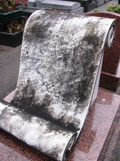 – Sur une tombe de bibliophile (?), un parchemin minéral cite Victor Hugo : "Les livres sont des amis froids et surs".