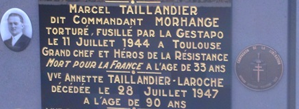 Marcel TAILLANDIER (1911-1944) rassembla dès 1940 autour de lui, en zone libre, les premiers éléments d’un groupe qu’il destinait à la lutte contre les services de renseignements ennemis. En 1943, le groupe "Morhange", qui portait son pseudonyme, passa à l’offensive contre les agents ennemis. Le 2 juin 1944, Marcel Taillandier pourtant encerclé à Toulouse, parvint à se sauver en s’enfuyant par les toits. Ce même mois, il forma un maquis dans la région de Quérigut (Ariège). En juillet, près de Toulouse, alors qu’il était en route pour assurer une importante liaison avec le maquis du Gers, il tomba avec plusieurs camarades sur un contrôle de police allemand. Parvenu à s’enfuir, il se réfugia sur le toit de l’église du village. Dénoncé aux Allemands par une habitante, il fut abattu immédiatement. Enseveli dans une fosse commune à Toulouse, le corps de Marcel Taillandier fut identifié après la libération et inhumé dans le cimetière de Châteaugay.