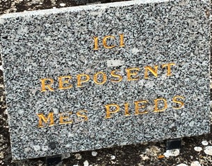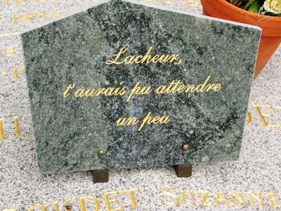 Etre taphophile, ce n’est pas seulement passer son temps à voir de magnifiques tombeaux et des sépultures de notoriétés, c’est avant tout arpenter, sur des kilomètres et des kilomètres, des mètres linéaires de dalles modernes sans aucun attrait, parfois difficilement lisibles, toutes plus ternes les unes que les autres. Dans ce royaume de la platitude, les plaques "post mortem" ont une place de choix : à l’image de ce que dénonçait avec humour Marie-Paule Belle, où est ce qu’on les enterre tous ceux qui sont méchants ? Ce ne sont que veuves éplorées, époux inconsolables, enfants désolés... Seuls échappent le plus souvent les tombes d’enfants, dont les témoignages, souvent naïfs, attestent d’une peine véritable capable d’émouvoir le plus endurci des taphophiles. Le phénomène n’est pas nouveau : les vieux ouvrages du début du XIXe siècle abondent d’épitaphes dont le lacrymal le dispute au mauvais goût. Les marbriers - et leurs clients - s’entêtent à nous faire croire que si le temps passe, le souvenir reste, alors que nous sommes bien placés pour savoir que ce n’est pas vrai. L’épitaphe, c’est comme les bouteilles de lait : on les achète à l’unité ou en packs de six ! On les choisit sur catalogues, on suit les modes... Au "A Lourdes, j’ai prié pour vous" des années 1910 a fait place l’inénarrable "Fauvette, si tu voles près de cette tombe, chante lui ta plus belle chanson" à partir des années 30, puis dans les années 90 des extraits plus ou moins malhabiles de chansons sans grâce.