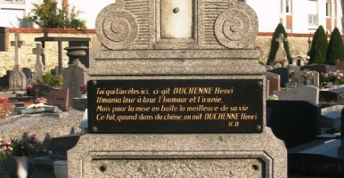 Toi qui t’arrêtes ici, ci-gît Duchenne Henri / Il mania tour à tour l’humour et l’ironie / Mais pour la mise en boîte la meilleure de sa vie /Ce fut, quand dans du chêne, on mit Duchenne Henri