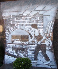 – Une imposante stèle contemporaine sur la tombe d’un boulanger le reproduit dans son cadre professionnel.