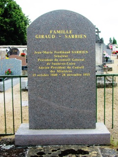 C’est ici que repose Ferdinand SARRIEN (1840-1915) : avocat républicain, maire de la ville, il fut élu député de Saône-et-Loire et siègea aux côtés des radicaux. Il devint très vite l’un des piliers de ce parti. Dès 1885, il participa au gouvernement et obtint à plusieurs reprises les portefeuilles de l’Intérieur et de la Justice. Il était ainsi le Garde des Sceaux au cours de l’Affaire Dreyfus. Radical modéré, Sarrien évita de se compromettre avec la politique combiste, ce qui lui valut la sympathie des modérés du centre. Après la chute de Combes (janvier 1905) et le passage de Rouvier au pouvoir, le Président Armand Fallières décida de le nommer Président du Conseil. Ce personnage effacé mais influent fut capable de rassembler les différences forces du centre et du parti radical. C’est ainsi que Sarrien parvient à constituer une équipe prestigieuse. Il nomma Léon Bourgeois ministre des Affaires étrangères, Raymond Poincaré aux Finances, Aristide Briand au sulfureux ministère des Cultes. Surtout, il parvint à faire entrer au gouvernement Georges Clemenceau, lequel prit le portefeuille de l’Intérieur, et qui se considéra d’ailleurs comme le véritable chef du gouvernement. Les fortes personnalités de Briand et Clemenceau éclipsèrent bien vite Sarrien. C’est sous sa présidence que l’affaire Dreyfus prit fin, que la décision de transférer Zola au Panthéon fut prise, et qu’une loi instituant le repos hebdomadaire obligatoire fut votée. Sarrien fut par la suite sénateur.