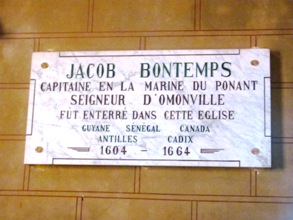 A l’intérieur de l’église d’Omonville, une plaque y signale la dépouille de Jacob BONTEMPS (1604-1664), qui fut seigneur du lieu, mais également le capitaine de la marine du Ponant envoyé par Richelieu pour faire du commerce en Afrique, au Canada et aux Antilles.