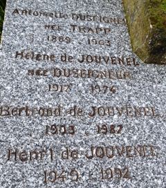 Le caveau Jouvenel est récent, et il est probable qu’il date de l’inhumation de Henri de Jouvenel (+1994), fils de Bertrand et de Hélène Duseigneur. La vieille croix moussue qui s’y trouve provient probablement de l’ancien tombeau.