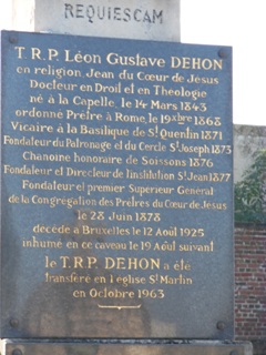 Léon DEHON (1843-1925) fut vicaire à Saint-Quentin où il fonda un collège. Il s’inscrivit, dans la foulée de l’encyclique Rerum novarum du pape Léon XIII, comme l’un des principaux artisans de la diffusion de la doctrine sociale de l’Église. Il fut le fondateur de la Congrégation des prêtres du Sacré-cœur de Jésus, destiné à l’évangélisation et à l’action sociale, qui essaima dans l’ensemble du monde.