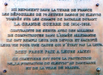 Enrôlés de force, 30 000 paysans du Jutland du Sud, territoire danois qui faisait à l’époque partie de l’Allemagne, ont dû combattre dans l’armée allemande. une nécropole danoise se situe à une dizaine de kilomètres de Soissons, à Braine. Elle contient 79 tombes de Danois morts au cours de la Grande Guerre sur le sol de France. Leur histoire est particulière : originaires du Slesvig, territoire annexé