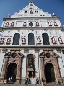 Large édifice religieux de style Renaissance finissant, en plein coeur de la ville, elle résulte de la volonté de l’électeur Guillaume V de relever le catholicisme dans ses Etats suite à la Réforme. L’impressionnante façade combine des éléments structurellement baroques dans son triple niveau surmonté d’un fronton et soutenus de discrets piliers (plutôt que de colonnes). La décoration cependant, marque nettement un début de classicisme dans sa recherche de lignes symétriques et son maniérisme. Si, entre les deux portes d’entrée se trouve la statue traditionnelle de l’archange saint Michel tuant l’ennemi de la foi, aux niveaux supérieurs de la façade les niches contiennent des statues des seigneurs de la famille de Bavière et non des saints comme on pourrait s’y attendre.