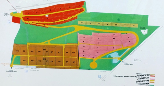 – la partie haute se divise en deux parties : le cimetière "haut" (marron), plus récente quoiqu’elle contienne également des tombes du XIXe siècle et le "cimetière nord" (rose), la partie la plus contemporaine (c’est dans celle-ci que se trouve la tombe d’André Boulloche).