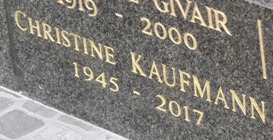 repose l’actrice allemande Christine KAUFMANN (1945-2017) [1]. Celle qui fut l’épouse de l’acteur Tony Curtis avait été une enfant star, remarquée dès l’âge de sept ans, en 1952, dans une adaptation de Im weißen Rößl (L’auberge du cheval blanc).Elle devint une vedette internationale quand elle joua au côté de Kirk Douglas dans Ville sans pitié (1961). Elle fut aussi une femme d’affaires avisée faisant la promotion de sa propre ligne de produits cosmétiques. Elle repose auprès de sa mère française (Geneviève Givair) et de ses arrières-grands parents).