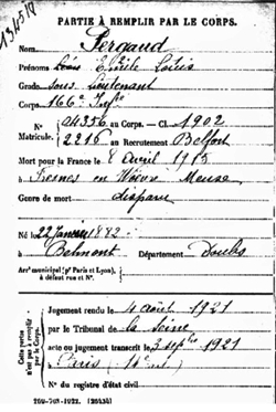 Le 4 août 1921, Louis Pergaud fut déclaré « mort pour la France ». On remarque que son identité est portée sur plusieurs monuments aux morts de la région.