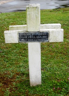 magistrats lyonnais, il s’engagea dans l’armée et prit part à la Première Guerre mondiale. Gendre du général Charles Mangin, il entra à l’Ecole de Guerre en 1937. Il rallia les FFL dès juin 1940 et fut condamné à mort par contumace. A Londres, il servit d’abord à l’Etat-major du général de Gaulle et fut emmené comme officier d’Etat-major personnel par le général lors de son premier voyage au Moyen-Orient avant de devenir le chef d’Etat-major du général Catroux.Il reçut le commandement de l’Est syrien, puis en janvier 1943 celui de la 2e Brigade française libre. Il se battit en Libye, traverse la Cyrénaïque, la Tripolitaine, prit part aux combats de Tunisie, puis fut nommé général de brigade en 1943, prenant le commandement de la 1ère Division Française Libre qui débarqua en Italie et participa à la bataille du Garigliano puis à ceux de Pontecorvo. Début juin, il prit part à la prise de Rome et, fin juin, aux combats de Toscane. Avec la 1ère DFL il débarqua en Provence, participa encore à la prise de Toulon et d’Hyères, puis à la poursuite dans la vallée du Rhône, et enfin le 3 septembre à la prise de Lyon, Autun, et Dijon. Il commanda ensuite la DFL lors de la Bataille des Vosges fin 1944. Peu de temps après, au volant de sa jeep, il dérapa sur le pont du Rahin, à Champagney en Haute-Saône, et s’écrasa au fond du torrent : on retrouva son corps deux jours plus tard. L’acteur Jean-Pierre Aumont, alors lieutenant et qui était son aide de camp, réussit à sortir vivant de l’accident. Pour l’anecdote, lors du débarquement en Provence, Diego Brosset fut hébergé chez la famille Chirac, réfugiée au village du Rayol sur la côte varoise. Il se lia alors d’affection avec le jeune Jacques Chirac, âgé d’une douzaine d’années. Ce dernier, apprenant la mort du général quelques mois plus tard, décida de son propre chef, de baptiser par un panneau un chemin du Rayol « avenue du Général-Brosset », panneau qui resta une trentaine d’années en place. En 1975, le conseil municipal du Rayol décida de baptiser officiellement une rue du village du nom du général. Se souvenant du premier hommage sauvage, la municipalité convia Jacques Chirac, alors Premier ministre, qui assista à la cérémonie en présence des deux enfants du général. Il repose auprès de ses hommes.