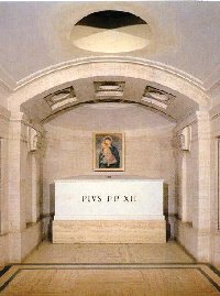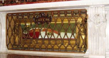 Inhumé dans les grottes vaticanes de Saint-Pierre, son corps embaumé fut remonté dans la basilique après sa béatification en 2000 par Jean-Paul II. Sa châsse est aujourd’hui l’objet d’une très grande ferveur.