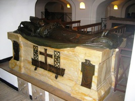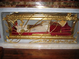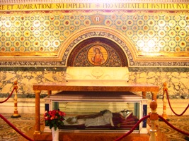 Son corps embaumé (son visage est recouvert d’un masque en or) se trouve dans la basilique Saint-Pierre.