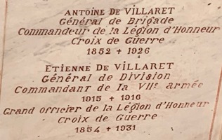 le général Antoine de VILLARET (1852-1926), qui fut lors de la bataille de Tournai de 1914 un des rares officiers généraux à être capturé lors de la Première Guerre mondiale. Avec lui repose son frère, le général Etienne de VILLARET (1854-1931), qui servit en Algérie, fut envoyé au Japon réorganiser l’armée japonaise, devint en 1914 le chef de la Mission militaire française en Grèce puis combattit sur le front dans l’Aisne. C’est à la suite de ses directives que six hommes furent exécutés à Vingré dans l’Aisne en décembre 1914. Ces six soldats "fusillés pour l’exemple", les martyrs de Vingré, furent réhabilités en 1921. La famille de l’un des fusillés porta plainte contre lui, , mais cette plainte fut classée sans suite. Le général Étienne de Villaret exerça son commandement jusqu’à la fin de décembre 1916, époque à laquelle il fut élevé à la dignité de grand officier de la Légion d’honneur.