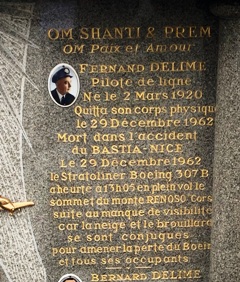 Le 29 décembre 1962, 25 passagers et membres d’équipage disparaissaient dans un accident d’avion sur le Monte Renoso, en Corse. Le Boeing 307 avait décollé de Bastia pour rejoindre Nice via Ajaccio. A son bord les équipes senior masculine et féminine de l’emblématique BBCB , le club de basket bastiais. Aucun des passagers et membres d’équipage ne survécut à ce drame, les mauvaises conditions météo empêchant les secours d’accéder rapidement au lieu de l’accident. La tombe du pilote de ligne Fernand Delime évoque les circonstances du drame et souligne la croyance bouddhiste du défunt.