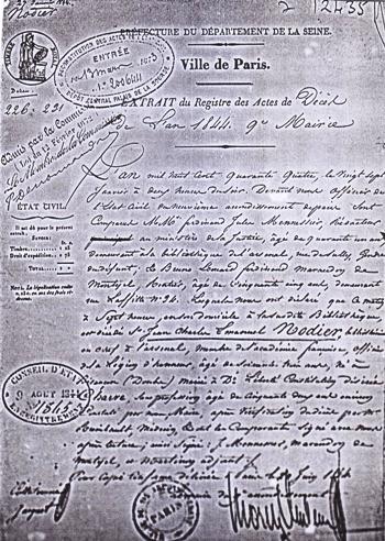 Son buste en marbre est de David d’Angers. La tombe de Nodier se trouve dans un secteur qui fut particulièrement touché lors des dernières journées de la Commune. Il est de tradition, quand on fait visiter sa tombe, de montrer les impacts de balles reçus.
