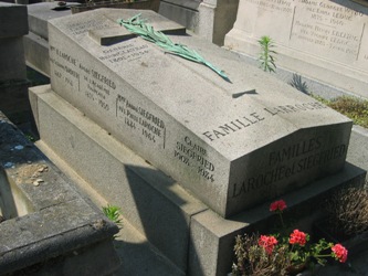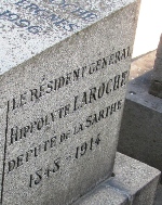 Il repose dans le caveau de famille de son épouse. S’y trouvent également le général de l’infanterie coloniale Henri CLAVEAU (1891-1954) ainsi que Hippolyte LAROCHE (1848-1914). Préfet de la Charente, d’Alger, de la Loire et de la Haute-Garonne, il fut nommé gouverneur de Madagascar dans les années 1890. A ce titre, il fut à l’origine, non sans peine, de l’abolition de l’esclavage mais également du traité reconnaissant la prise de possession du territoire par la France, qu’il extorqua à la reine Ranavalona III en 1896, mettant à la fois fin à l’indépendance de l’île et à une monarchie qui durait depuis le XVIe siècle. Il dirigea ensuite durant quelques années le régime de protectorat qui régit l’île, avant de retourner en France où il devient député de la Sarthe, entre 1906 et sa mort.
