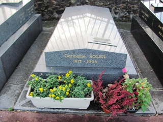 ("M... Soleil", suivi d’un soleil stylisé, et, en-dessous, "Germaine Moritz 19.. [le chiffre 13 n’est plus lisible] -1996.), qui subsiste. Sur le devant de la pierre tombale, l’inscription est "GERMAINE SOLEIL 1913 -1996".