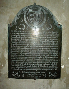 "Passant, si tu es curieux de savoir qui gît en cette chapelle, c’est le corps de Messire Pierre de Bourdeilles en son vivant chevalier gentilhomme ordinaire de la chambre des Rois Charles IX & Henri III, chambellan de Monsieur le duc d’Alençon leur frère et pensionnaire des dits rois de la somme de cent mille livres par an, Seigneur et baron de Richemont, de St Crépin, la chapelle Montmoreau & coseigneur usufructaire (usufruitierà de Brantome, issu du coté paternel de la très noble et antique race de Bourdeilles renommée dès le temps de Charlemagne, comme les histoires anciennes et vieux romans, tant français, italiens qu’espagnols & titres vieux et antiques monuments de la maison le témoignent de père en fils jusqu’à aujourd’hui et du coté maternel de cette grande et illustre race de Vivonne et de Bretagne. Il fit son premier apprentissage aux armes sous ce grand capitaine Monsieur François de Lorraine duc de Guise et eut sous sa charge deux compagnies de gens de pieds, & ne dégénéra en rien de la vertu de ses ancêtres, mais se trouva en plusieurs guerres et combats hasardeux, tant en France qu’en pays étrangers : même le roi de Portugal Dom Sebastien honorant sa valeur au retour de la conquête de la ville de Belys et son Pignon en Barbarie le fit chevalier de son ordre appelé l’habito de Christo et nonobstant toutes ces grandeurs il n’a jamais eu de repos et contentement en ce monde, aussi une âme généreuse n’en pouvait avoir que denas le ciel.