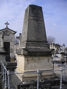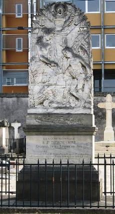 — La stèle du colonel Joseph Deschamps (+1833), oeuvre de Florent Bonino, qui célèbre les vertus militaires de cet officier des armées impériales : sur la façade principale, une Victoire et un Génie ailé pleurent sur la cravate du drapeau d’Austerlitz, tandis qu’au dessous d’eux flottent étendards et drapeaux sur lesquels sont inscrits Arcole et Marengo. Dans l’axe de la composition, une colonne qui porte l’inscription Ulm est surmontée d’un aigle impérial aujourd’hui décapité. L’ensemble était jadis peint mais le monument actuel de garde pas de trace de polychromie.