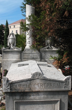 – La belle tombe (avec cippe et urnes) pour la famille Cartereau, signée par l’architecte E. Clément.