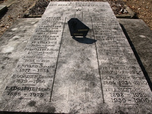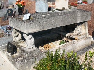 – L’étonnante tombe -pourtant en reprise- d’Henri Voisin, jeune homme de vingt cinq ans mort en 1945, constitué d’un tablier porté par quatre cariatides figurant les arts.