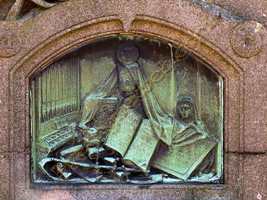 Le buste médaillon en haut-relief est d’Ogé fils, et le bas-relief en bronze, une composition équilibrée des attributs de la musique et du sacerdoce, est de Paul Guibé.