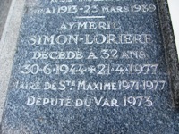 Dans la même tombe repose Aymeric SIMON-LORIÈRE (1944-1977), dont la trajectoire en politique fut marquée du double sceau de la brièveté et de l’exceptionnel. Issu d’une famille d’industriels parisiens – il comptait parmi ses ancêtres Hippolyte Marinoni, patron de presse et inventeur de l’imprimante rotative -, il fut remarqué très jeune par plusieurs responsables de l’UDR et rejoignit le cabinet du ministre de la défense Michel Debré en qualité d’attaché parlementaire, en 1970. Maire de Sainte-Maxime, dans le Var, en 1971 ; député de ce même département en 1973, secrétaire d’âge de l’Assemblée, Aymeric Simon-Lorière s’inscrivit au groupe de l’Union des démocrates pour la République (UDR) où il manifesta une sensibilité « sociale ». Alors que tout semblait lui prédire une carrière brillante aux plus hauts postes et qu’il briguait la mairie de Toulon, il fut retrouvé mort dans son appartement. L’enquête conclue à un suicide par balles.