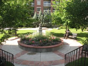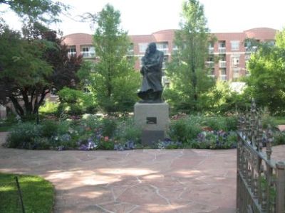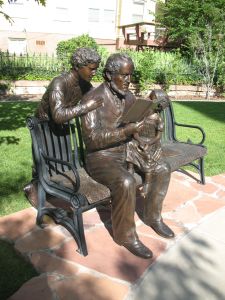 Un escalier permet de descendre dans un second jardinet. Au centre, un buste de Brigham Young. Une sculpture en bronze sans doute édifiante mais plutôt naïve représente Brigham assis sur un banc faisant la lecture -forcément sainte- à deux enfants.