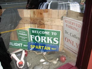 Evidemment, le village vit depuis plus d’un an à l’heure Twilight : on mange, on dort, on boit Twilight. Dès l’arrivée dans la bourgade, des panneaux indiquent la couleur ! On pénètre dans Forks par l’officine du shérif (il doit être constamment importuné dans la mesure où c’est le métier du père de l’héroïne). Devant l’office de tourisme, la Chevrolet rouge de la jeune fille (en fait, c’est « une » Chevrolet rouge, pas celle du film). L’office de tourisme propose évidemment des circuits « Twilight » : la maison de Bella (parmi d’autres maisons assez semblables), le lycée, l’hôpital ou travaille le père Cullen, et clou de la visite : la maison Cullen ! Alors là, les amateurs vont être déçu : si dans le film elle apparaît telle une propriété aux lignes modernes perdue au plus profond de la forêt, il s’agit en réalité d’un Bed & Breakfast en plein milieu de la ville. Magie du cinéma…