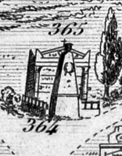 La tombe de LAPLACE au Père-Lachaise (n°364 sur la gravure : un obélisque de marbre blanc) se trouvait précisément juste devant celle de D’ABOVILLE (n°365) dans la 25e division. Sur la gravure tirée du plan d’Henry, on reconnaît d’ailleurs parfaitement les canons qui ornent la structure néo-classique de la tombe de ce dernier, toujours visible de nos jours d’ailleurs. La tombe de LAPLACE a dû être transférée à Saint-Julien-de-Mailloc au cours de la seconde moitié du XIXe siècle.
