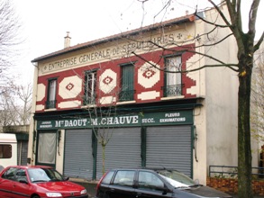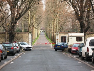 – L’entrée des cimetières parisiens périphériques (Saint-Ouen, Batignolles, Ivry, Pantin), aménagés souvent à la même époque, se ressemblent : d’un boulevard principal part une allée sans issue qui mène à la porte du cimetière. Ses allées, souvent plantées de platanes, voient défiler de part et d’autres des bâtiments de conservation, des marbriers et des fleuristes. Certains de ses immeubles, souvent en biques, ont un certain cachet comme c’est le cas ici.