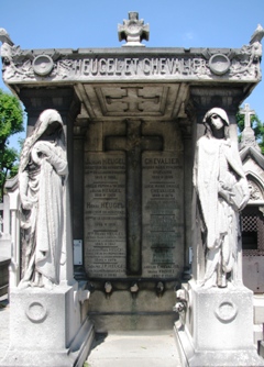 – Le caveau de famille des éditeurs Heugel : cette maison d’édition française fut fondée en 1833 par Jacques Léopold HEUGEL (1815-1883), qui fut aussi administrateur de la S.A.C.E.M. dès sa création en 1850. Jusqu’en 1980, elle appartint à ses descendants, tous inhumés ici : son fils Henri Georges (1844-1916) et son petit-fils Jacques Paul (1890-1979). Son histoire est étroitement liée à celle de la revue le Ménestrel, née la même année et qui cessa de paraître, plus que centenaire, en 1940. (Son siège de la rue Vivienne fut d’ailleurs baptisé « le Ménestrel » en 1847.) Tous les genres musicaux, sans parler de nombreux ouvrages pédagogiques, ont bénéficié de son activité, mais ce sont surtout les partitions d’opéra qui ont fait sa fortune, avec la plupart des succès de Massenet, le Roi d’Ys de Lalo, Louise de Charpentier, etc. La maison a fusionné avec Leduc en 1980. Dans leur caveau repose également le statuaire Chevalier (voir plus haut). Leur tombe est belle, encadrée de deux cariatides, mais abîmée.