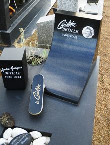 - Une figure locale qui parlera à certains nantais : la tombe originale du champion de skate Christophe Bétille (+2009), qui figure un skate et une rampe.