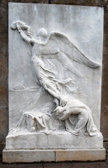– À gauche de l’entrée historique du cimetière, un bas-relief intitulé Vers l’infini, œuvre de Blanche Moria, est exposé depuis 1928.