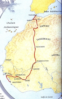 de Boké en Guinée, il fut retenu cinq mois — gravement atteint du scorbut — à Timé dans l’actuelle Côte-d’Ivoire. Enfin, il atteignit en avril 1828 la cité mythique de Tombouctou, premier européen à réussir cet exploit, mais déçu de trouver une cité tombant quelque peu en ruines.