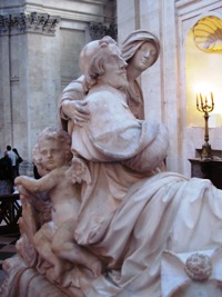 C’est dans le chœur que se trouve le tombeau du fameux Armand Jean du Plessis, cardinal-duc de RICHELIEU (1585-1642). Il est d’usage sur ce site de ne pas s’appesantir sur la biographie de personnalités aussi célèbres, dont Internet regorge de données : rappelons simplement qu’il fut un efficace et pragmatique ministre de Louis XIII, qui lui conserva sa confiance dans un contexte difficile ; et que c’est à lui que l’on dut l’édification progressive de l’absolutisme dont Louis XIV fut le bénéficiaire, au prix de la soumission de la noblesse, de certaines élites urbaines, et des protestants du royaume. A la mort du cardinal, la duchesse d’Aiguillon, sa nièce et héritière, prit en charge ses dernières volontés. Elle commanda un tombeau monumental à Girardon, qui ne fut achevé qu’en 1694, le corps de Richelieu étant déposé dans une crypte sous le cénotaphe.
