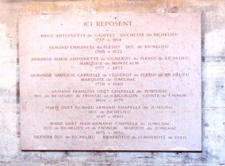 On sait moins que 27 membres de la famille des ducs de Richelieu ou de Fronsac reposèrent, à la suite du cardinal, dans l’église de la Sorbonne qui devint ainsi le Panthéon familial. Ceux qui y furent inhumés avant la Révolution connurent évidemment également les profanations de 1793, et ne sont donc plus ici que des souvenirs. Sous le vitrail aux armes du cardinal, une plaque rappelle la présence de sept membres de la dynastie dont les corps, post-révolutionnaires, se trouvent encore là ; à savoir les quatre derniers ducs [2] et certaines de leurs épouses. C’est en 1952 que fut inhumé le dernier d’entre-eux, Marie-Odet Jean Armand.