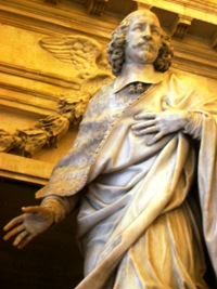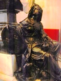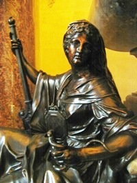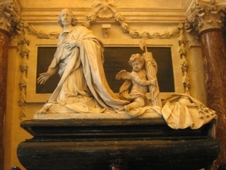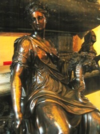 Sur la droite, on reconnaît le chapeau de cardinal. Dans la partie inférieure, les trois figures féminines de bronze sont des allégories de Vertus (la Prudence, la Paix et la Fidélité).