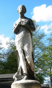 – La statue en pierre par Boverie sur la tombe Dubost est très abîmée et décapitée.