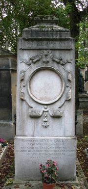 – Le buste en marbre par Jean-Jacques Flatters de la Raucourt fut volé en 2005. Il émergeait naguère du buisson dans lequel la tombe se trouve.