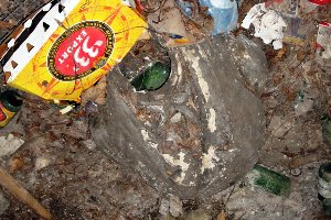 – C’est dans un état quasi archéologique que les restes d’un buste en plâtre se découvre, parmi les immondices, dans la chapelle Launet-Leclerc.