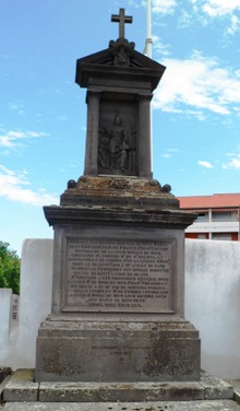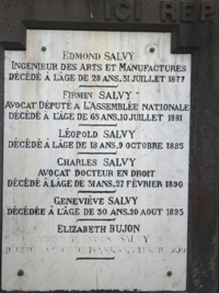 En ce qui concerne la sépulture Salvy, je mène actuellement "campagne" auprès de ma génération pour sa restauration d’ici le centenaire de la Grande Guerre 1914-1918. En effet, deux petits-fils de Firmin Salvy sont "morts pour la France" à la fleur de l’âge, Edmond Salvy (1881-1914), officier d’infanterie coloniale, et Georges-Henri Salvy (1886-1916), avoué à la cour de Riom. Leur plaque commémorative commune, initialement fixée sur la colonne en lave, s’est cassée et repose en morceaux au fond à gauche du caveau. Des devis sont en cours pour la remplacer, mais aussi restaurer les trois plaques à demi effacées, dont celle qui figure sur votre photo.