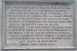 – Jean GRENIER (1751-1843) : magistrat français, il fut pendant deux ans un éphémère député de la Haute-Loire au Conseil des Cinq-Cents (1798-1799). Après le coup d’État de brumaire (auquel il ne s’était pas montré hostile), Grenier fut nommé membre du Tribunat pour le département du Puy-de-Dôme. Il fut un chaud partisan de l’établissement de l’Empire. Procureur général à la cour d’appel de Riom, il fut en 1811 créé baron d’Empire. Il fut encore fait Pair de France par la monarchie de Juillet. En 1833, l’Académie des sciences morales et politiques l’admit comme membre correspondant en raison des ouvrages estimés de droit et de législation dont il était l’auteur. On édifia à sa mort le beau monument sous lequel il repose. Son tombeau a été réalisé par le sculpteur Volvicois Michel Channeboux et représente le magistrat entouré d’ouvrages dont il est l’auteur, comme Le traité des hypothèques et Le traité des donations.