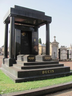 – Pierre (1866-1945) et Jeanne (1879-1958) DUCIS : lui fut artiste de théâtre à Toulouse, elle était fille d’un directeur de salle. Ils devinrent gérants des Casinos de Nice et de Menton, et propriétaires du Casino d’Enghien. Couple de philanthrope, ils fondèrent également diverses oeuvres. Ils reposent dans un caveau noir massif où existait anciennement un étonnant squelette qui, après avoir été décapité, fut enlevé. La mort figure à la manière d’une porte mystérieuse, des sentences lourdes inscrites de chaque coté.