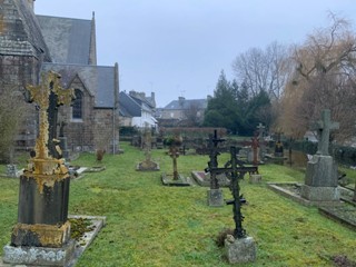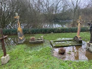 Rien de particulièrement notable dans le cimetière de Ponts, dans la périphérie d’Avranches -il fut un des anciens cimetières paroissiaux d’Avranches- , collé contre l’église Saint-Etienne ; si ce n’est qu’en ce mois de février, la Sée est encore hors de son lit et inonde la petite nécropole, qui a conservé son caractère ancien. Le fait n’est pas nouveau : des témoignages issus des registres paroissiaux au XVIIIe siècle en faisaient déjà état !